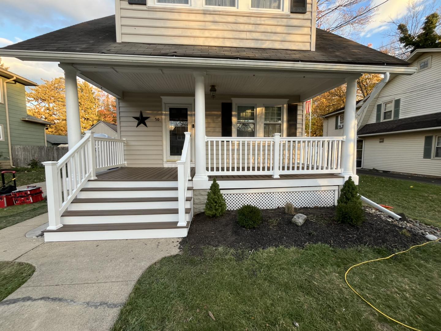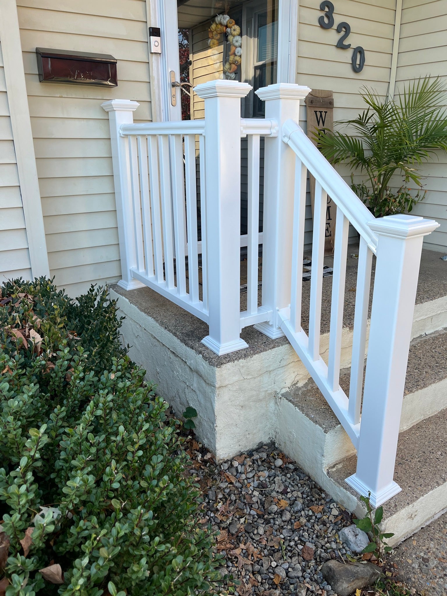 Removed customer's old metal railing and replaced them with white vinyl railings. Also performed a concrete repair on the corner of the porch.