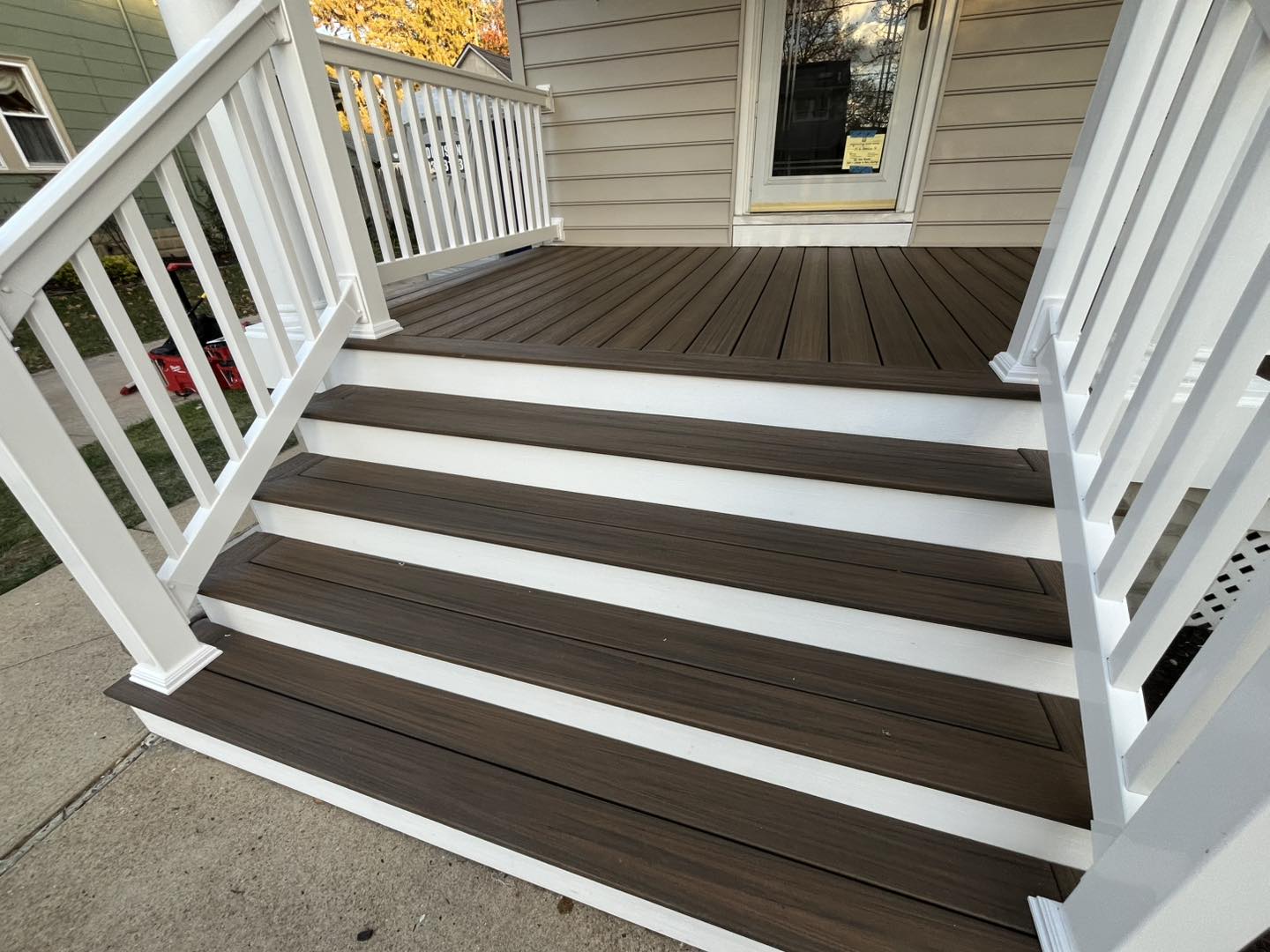 We demoed over 600 sq ft of old decking, railings, and stairs and rebuilt it from the ground up using Trex composite decking, white vinyl fascia, and new composite railings for a cleaner, modern, low-maintenance finish.