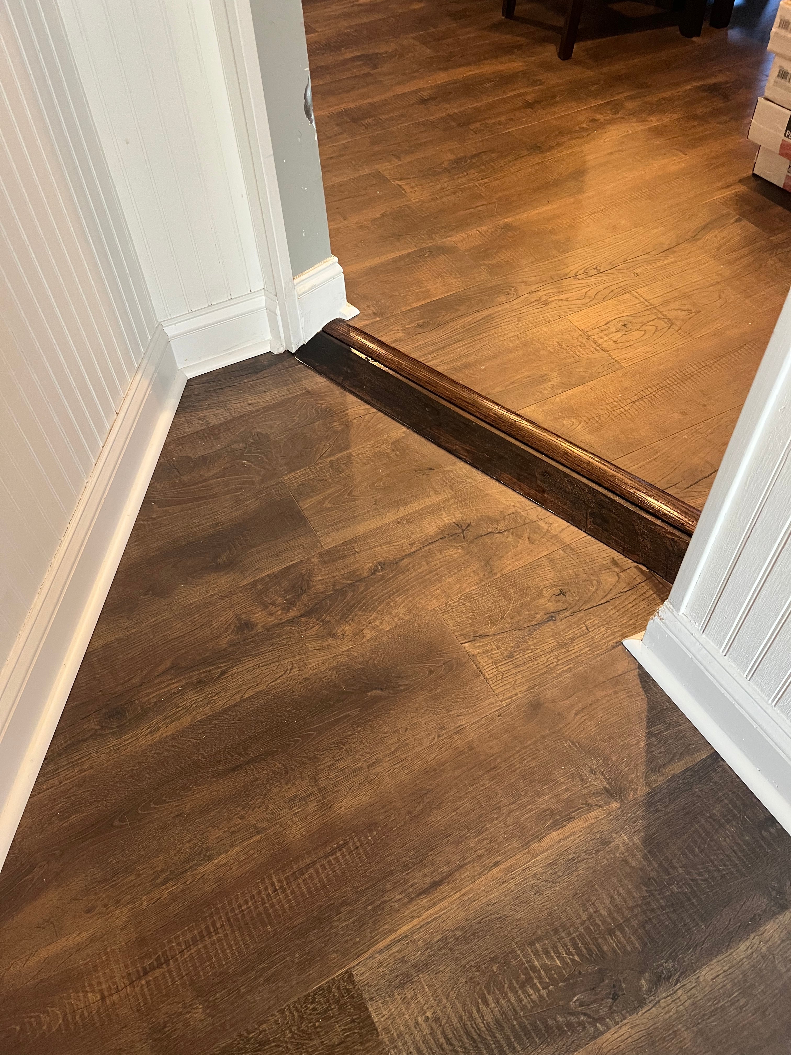 Fresh floors, fresh look! We replaced the old Pergo with new engineered wood floors throughout, repainted all baseboards and beadboard, and finished it off with new shoe moulding and transitions for a clean, modern upgrade.